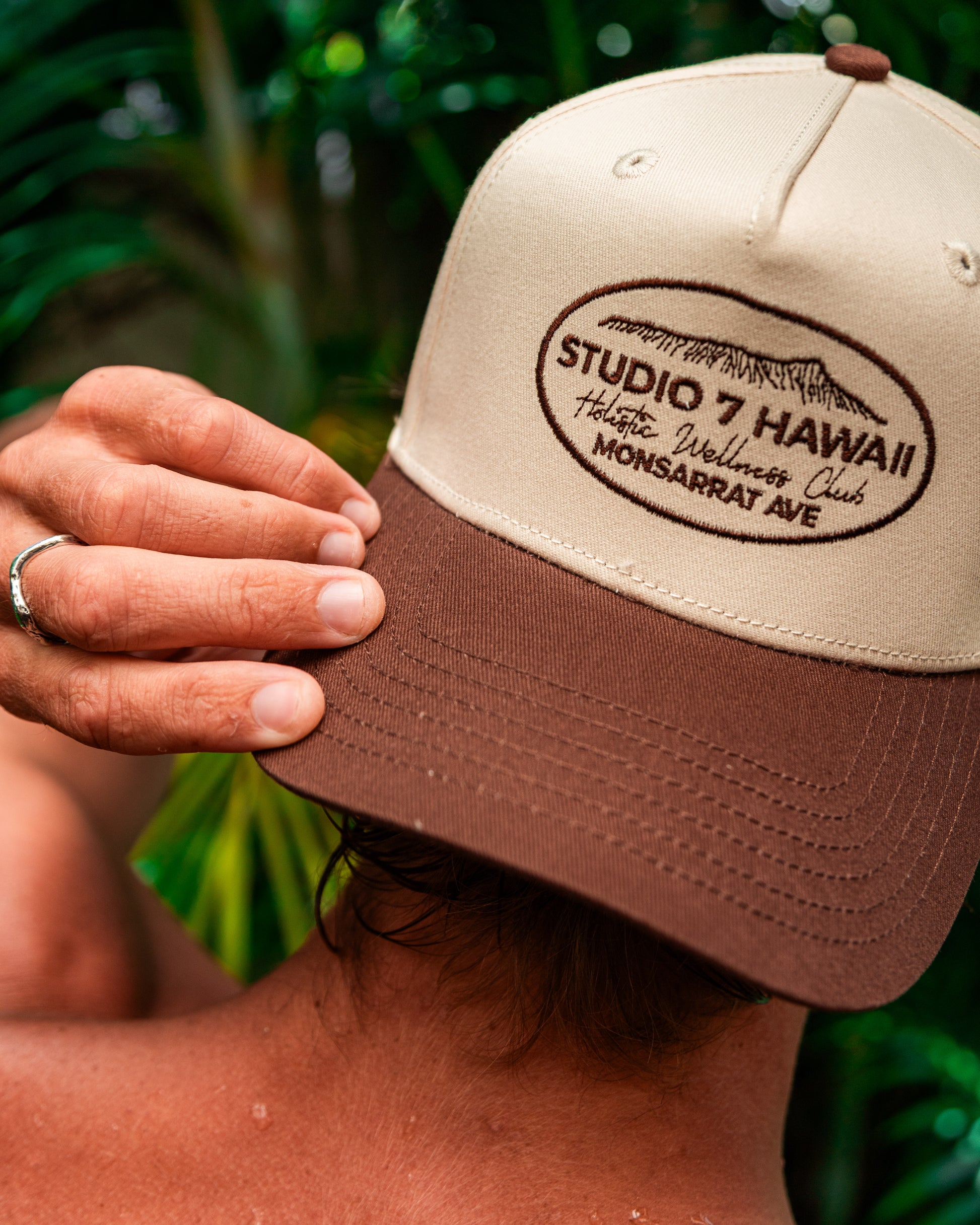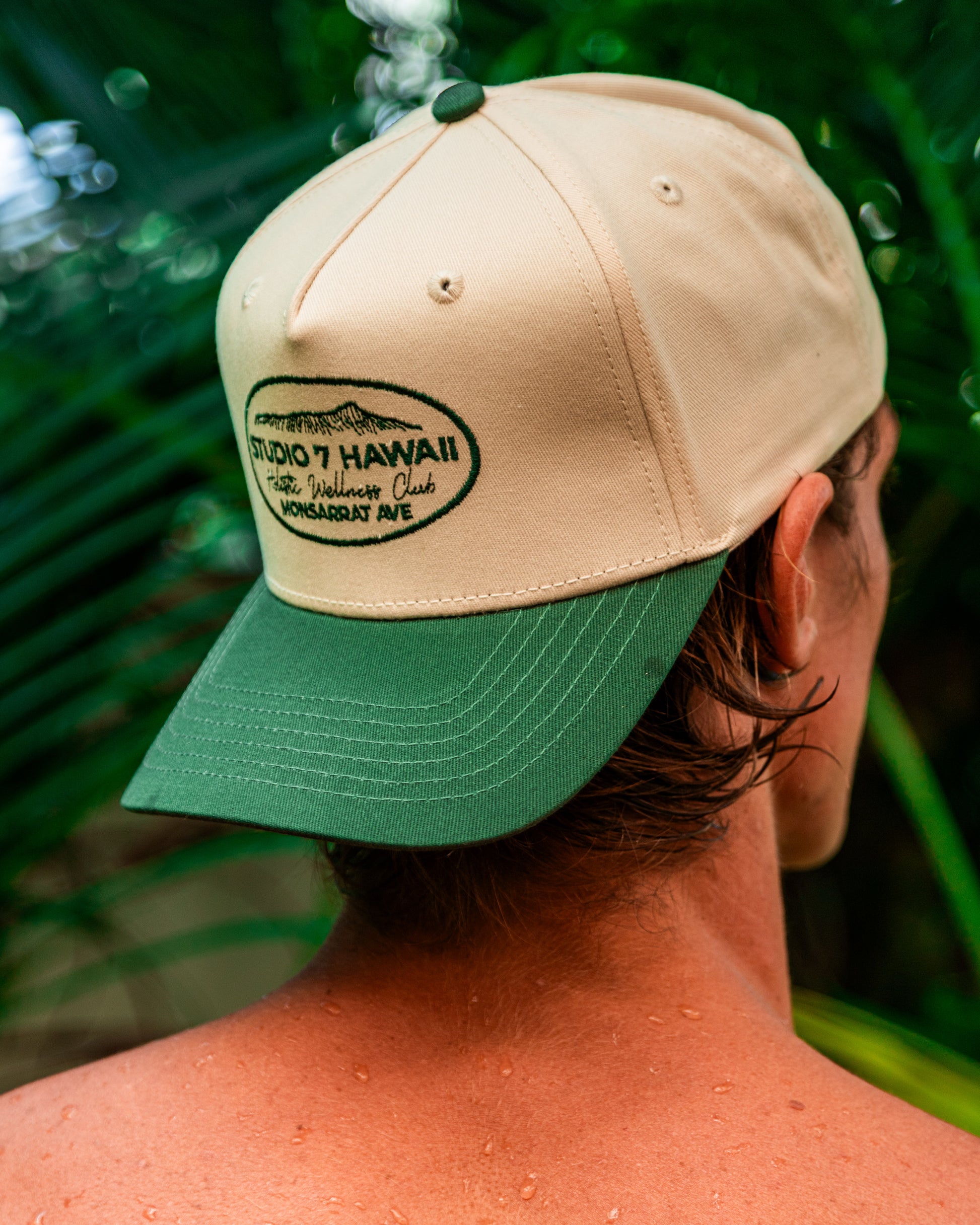 Clean lines, classic feel. The Studio 7 Hawaii "Monsarrat Ave" Cap is a mid-profile 5-panel design featuring a natural cotton crown, deep forest green brim, and embroidered logo inspired by our flagship studio on Monsarrat Ave. Finished with a cloth strap and metal buckle for an adjustable, low-key fit.